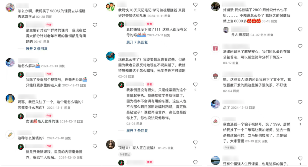 最直接的原因肯定是課程性價比太低。**不少網友反饋,爸媽幾乎把退休金全用來交學費。**但他們購買的絕大多數課程內容質量低下不説,還存在嚴重的誘導續費情況,當真是學海無涯、學費無底。