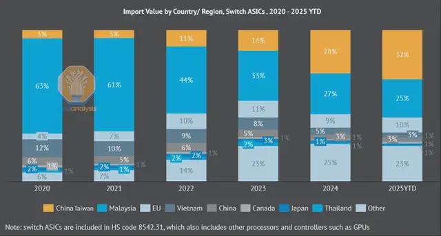 進一步深入研究發現,墨西哥是成品服務器最大的進口樞紐。從歷史數據來看,75% 至 80% 的服務器從墨西哥進口。2023 年和 2024 年,中國台灣地區搶佔了墨西哥的部分市場份額,墨西哥的市場份額降至約三分之二。這可能意味着,雖然大多數中央處理器(CPU)服務器由墨西哥發貨,但中國台灣地區在圖形處理器(GPU)服務器方面的市場份額更高。不過,從 2025 年年初至今的數據來看,墨西哥似乎具備相應的產能,表明墨西哥的供應鏈正在對關税風險做出反應。