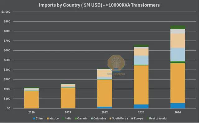 中壓 / 低壓變壓器在國內製造的比例要高得多,超過 50%,大部分進口來自墨西哥和其他拉丁美洲國家,以及韓國。