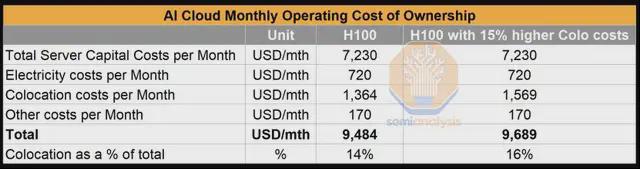 即使假設為了彌補關税影響, colocatio(託管)租賃成本增加 15%(這是一種較為極端的情況),運營一個 GPU 集羣的總體擁有成本也只會增加 2%。絕大部分成本是由服務器成本驅動的。