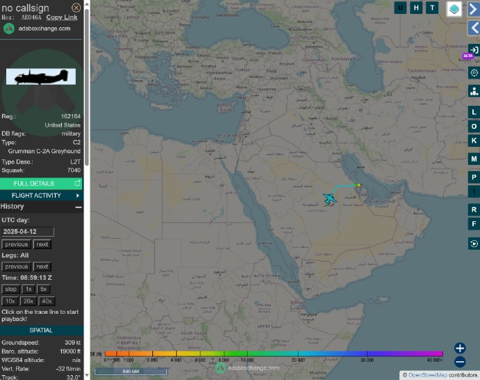 最後,還可以時不時看一看Flightradar24,這軟件可以追蹤飛機的應答機信號,時不時的就會有點驚喜。比如前幾天,就有人追蹤到一架美國海軍的C-2A灰狗艦載運輸機,飛行在沙特阿拉伯上空,從航向上看應該是從卡塔爾烏代德空軍基地到“杜魯門”號航母進行通勤的。