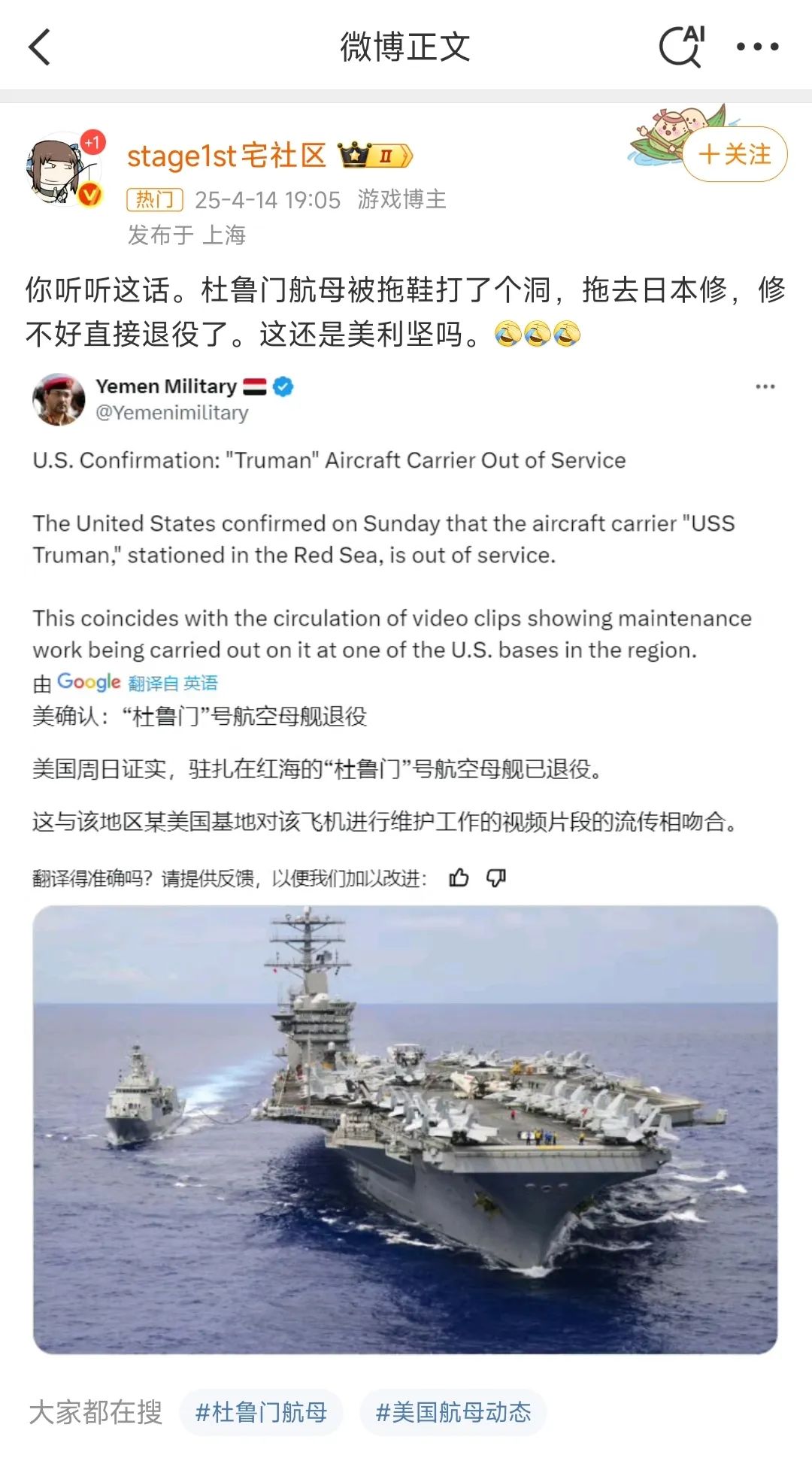 所以,綜合以上信息拼湊,所有信息都指向一個結論——“杜魯門”號現在沒啥大事,依然在執行任務中。所謂的被胡塞武裝老哥擊傷、重創、退出戰鬥、被迫退出現役等等,全部都是這個號稱是“也門武裝部隊”的自娛自樂的高仿賬號,搞出來的臆想。