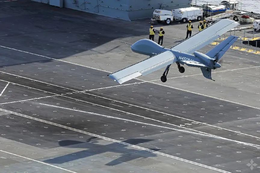 近年來,各國都在加快推進大中型水面艦船與無人機的集成運用。例如2023年11月,美國通用原子航空系統公司在英國皇家海軍“威爾士親王”號航母上,演示了“莫哈韋”無人機的短距起降能力。在此期間,該無人機在艦上無人機操控員的控制下,完成了起飛、盤旋、進近和着艦等操作。