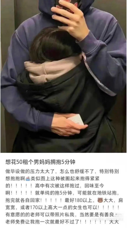 一位女生在準備畢設的時候壓力太大,就想到一個辦法——花50塊錢找個“男媽媽”擁抱5分鐘。