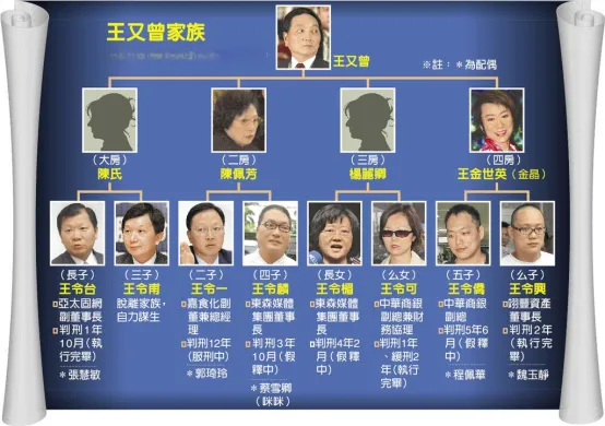 他的8名子女中,除大房所生的第三子王令甫因脱離家族事業、自立謀生而未受到牽連外,包括現任東森媒體集團董事長的第四子王令麟在內的7名兄弟姐妹,無一倖免,均吃上官司。有7個子女被判刑,其中有6個入監,力霸集團也“灰飛煙滅”了。
