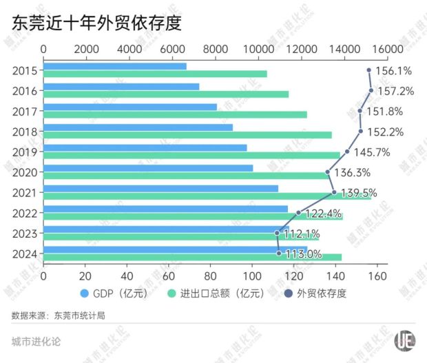 過去十年間,東莞外貿依存度已從2015年156.1%下降到2024年113.0%。東莞市外貿企業協會副會長周志昌此前也表示,得益於東莞製造業的轉型升級,傳統貿易商品(如衣物、食品)的比例下降,屬於新能源、高新技術產品的新業態正在逐漸確立。