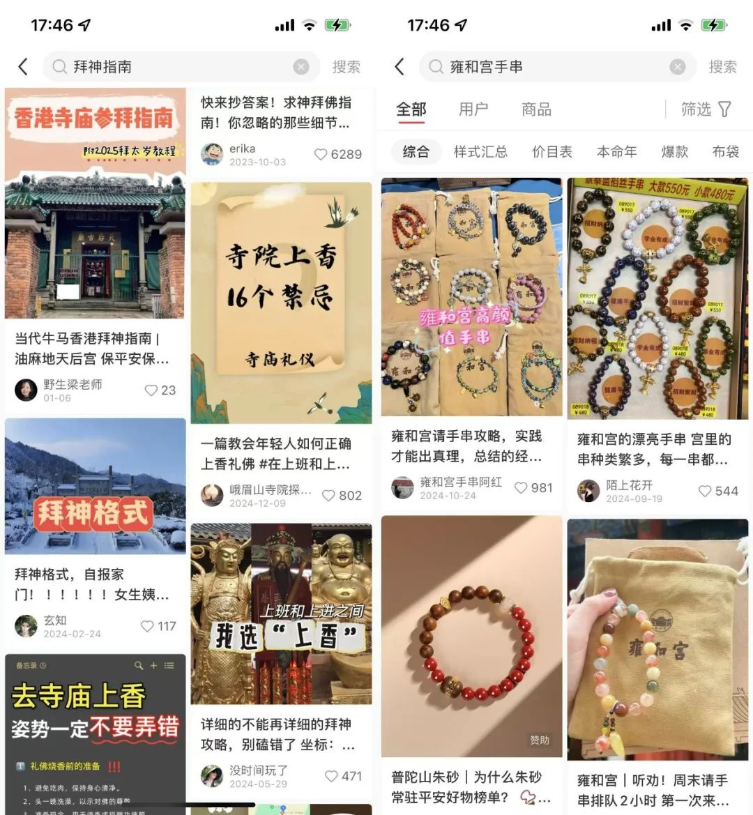 所以你在小紅書上搜索“寺廟”,#寺廟早上去還是下午去#這樣的入門級話題有1800萬+篇筆記,從各類寺廟攻略到法物分享,相關話題熱度始終居高不下。