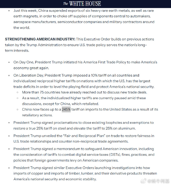 白宮網站顯示,美國對中國商品的最高關税達到245%.