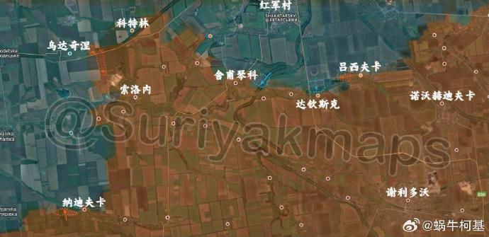 6、紅軍村:烏克蘭軍隊奪回了舍甫琴科以東鐵路沿線的部分陣地,而且從北部重新進入達欽斯克。另一方面,俄軍控制了納迪夫卡以西的基地,但該地西北的倉庫仍由烏克蘭控制)。俄軍還控制了呂西夫卡的新地區,並重新進入烏達奇涅。