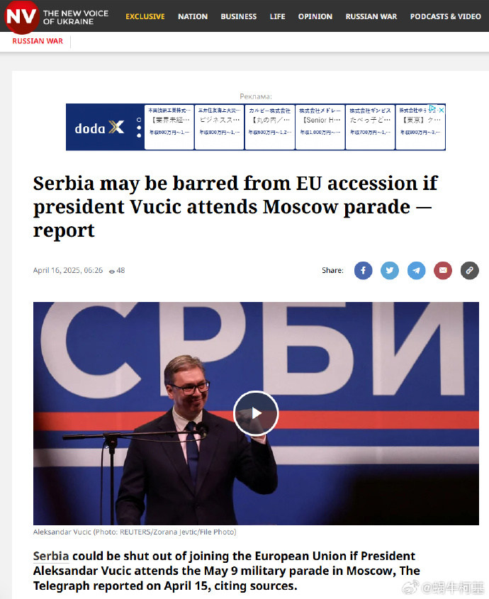 如果塞爾維亞總統亞歷山大·武契奇確認他打算下個月前往俄羅斯參加莫斯科一年一度的勝利日遊行,塞爾維亞可能會被拒絕加入歐盟。