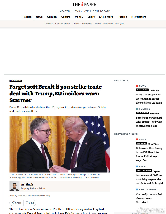 🇺🇸🇬🇧🇪🇺⚡ 歐盟繼續警告英國不要向特朗普做出任何貿易讓步,否則別想軟脱歐,要明白美國正在利用與倫敦達成貿易協定的可能性來挑起與歐洲國家之間的不和。