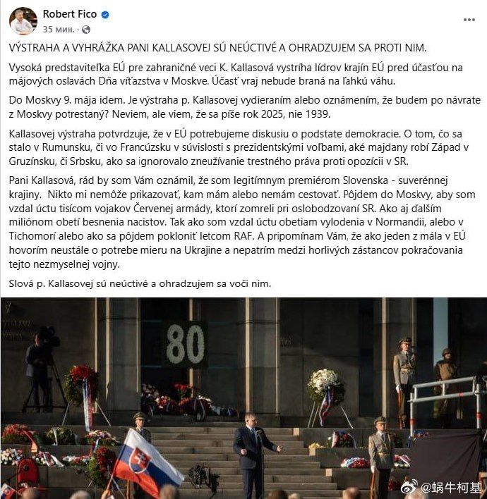 ‼️🇸🇰🇷🇺 斯洛伐克總理菲科回應歐盟外長卡拉斯關於禁止成員國參加勝利日遊行的言論: