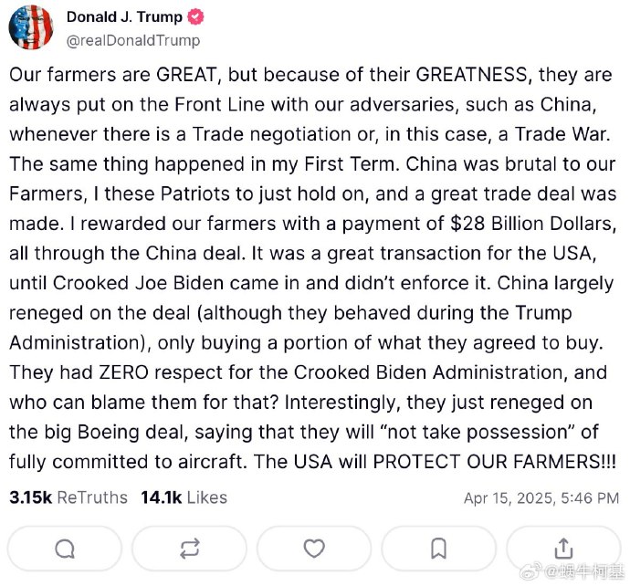 特朗普發文説中國欺負美國農民和波音