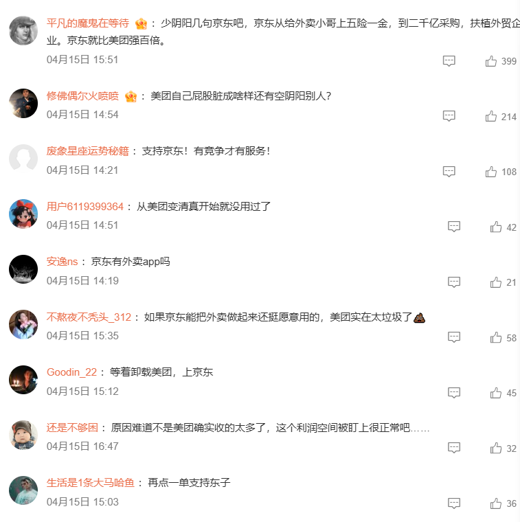 對於美團和京東的嘴仗,網友還是一如既往支持京東。