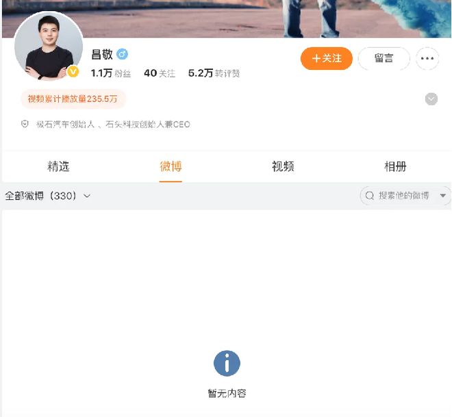 4月15日,極石汽車與石頭科技創始人昌敬突然清空其抖音(41.2萬粉絲)和微博(1.1萬粉絲)賬號全部內容,這一行為引發市場廣泛關注。