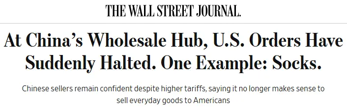 不過,襪子是一種利潤極低的商品。中國製造商表示,要通過降價來抵消145%的美國關税幾乎不可能(關税由進口商支付)。這意味着美國進口商要麼壓縮自身利潤、要麼提高美國零售價、要麼設法改從其他國家採購廉價襪子來保障美國人的雙腳依然温暖舒適。