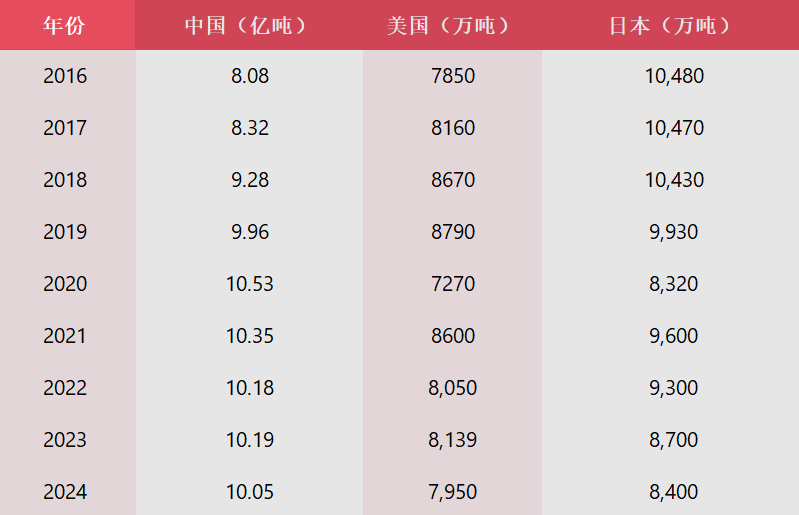 2018年的時候,美國的粗鋼產量為8670萬噸,2024年則下降至7950萬噸,連中國的十分之一都不到。