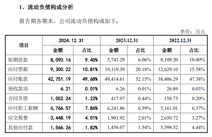 但從企業財報來看,公司報告期內負債規模也整體保持增長,其中應付票據、應付款佔比超半成。據瑞立科密招股書,報告期各期末,公司應付票據餘額分別為 12,629.10 萬元、19,119.39 萬元和 9,300.22 萬元,佔流動負債的比例分別為 15.58%、20.18%和 10.81%;公司應付賬款餘額分別為38,406.29 萬元、49,414.61 萬元和42,751.19 萬元,佔流動負債的比例分別為47.38%、52.15%和49.68%。