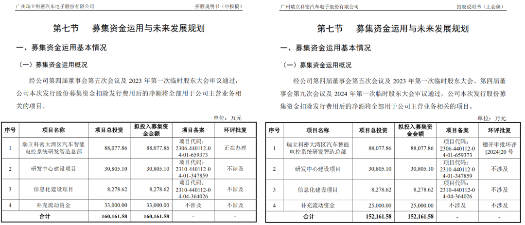 此次IPO,根據上會版招股書,瑞立科密擬募集152,161.58萬元用於“瑞立科密大灣區汽車智能電控系統研發智造總部”“研發中心建設項目”“信息化建設項目”以及補充流動資金,對比2023年首次提交的招股書,公司擬募集資金減少8000萬。
