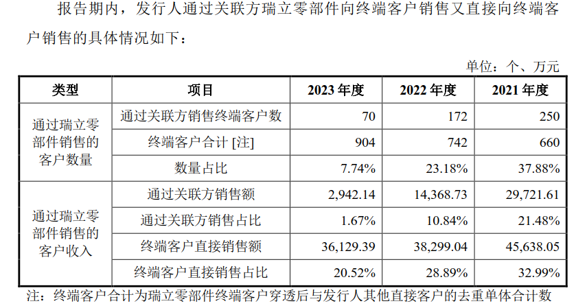 瑞立科密為減少關聯交易,增強銷售渠道獨立性,瑞立科密自 2021 年起逐步進行關聯方在終端整車廠客户處相關主動安全系統業務和產品的供應商資質轉移工作。隨着主要客户陸續完成切換,瑞立科密通過瑞立零部件銷售的單體客户數量由2021 年度的 250 家降至 2023 年度的 70 家,單體客户數量佔比相應的由 2021 年度的 37.88%降至 2023 年度的 7.74%。