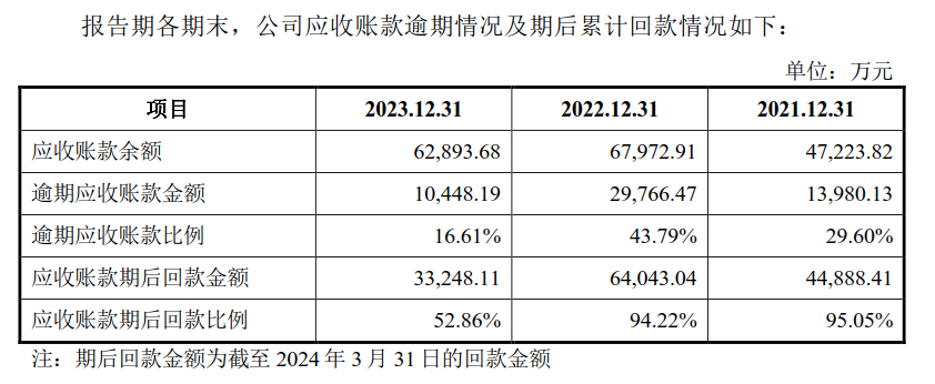 聚焦應收款項,瑞立科密在問詢函回覆中表示,賬齡 1 年以上的應收賬款前 10 大客户中,過半是因為經營狀況不佳,且部分已經發生糾紛。值得注意的是,瑞立科密2023年應收賬款期後回款比例僅52.86%。