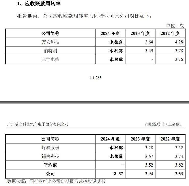 據瑞立科密提供的同業可比公司,公司應收賬款週轉率低於同行業可比公司,報告期各期,瑞立科密應收賬款週轉率分別為 2.53、2.94 和 3.37。