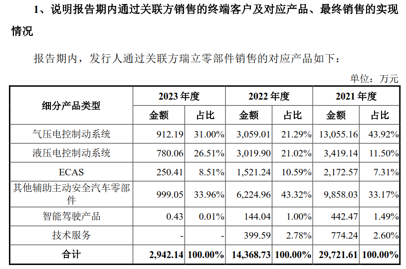 瑞立科密認為,公司與瑞立零部件雖同屬於制動系統產業鏈,但瑞立科密與瑞立零部件分別屬於電控制動和機械制動細分領域,在產品類型、形態及應用領域方面均存在較大差異;報告期內,瑞立科密對於尚未直接進入客户供應鏈體系的目標客户,存在通過關聯方瑞立零部件對終端客户進行銷售的情況。