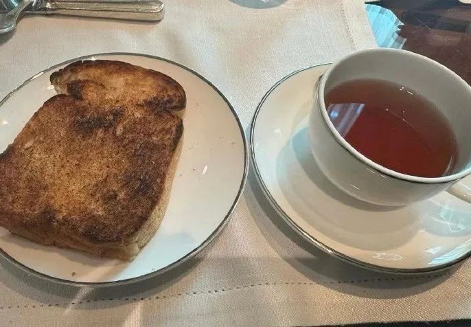 他的酒店早餐只有一杯茶水和一塊吐司,一切盡在不言中。