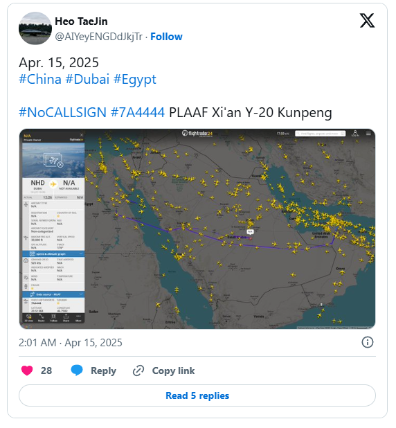 不久前中國國防部否認了有關埃及採購中國殲-10C戰鬥機的説法,最近又傳出埃及已經決定採購韓國FA-20輕型戰鬥機的消息,有關中埃兩國軍事合作的猜測少了很多。但沒有想到的是,開源航空信息顯示,大約五六架運-20大型運輸機出現在埃及上空!鑑於運-20只有中國空軍裝備,因此運-20如此大規模地出現在埃及,顯然非同尋常。