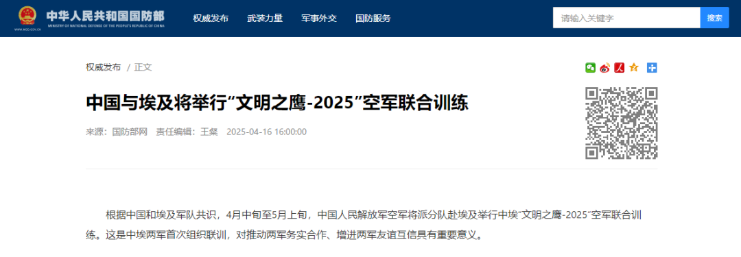 根據中國和埃及軍隊共識,4月中旬至5月上旬,中國人民解放軍空軍將派分隊赴埃及舉行中埃“文明之鷹-2025”空軍聯合訓練。這是中埃兩軍首次組織聯訓,對推動兩軍務實合作、增進兩軍友誼互信具有重要意義。