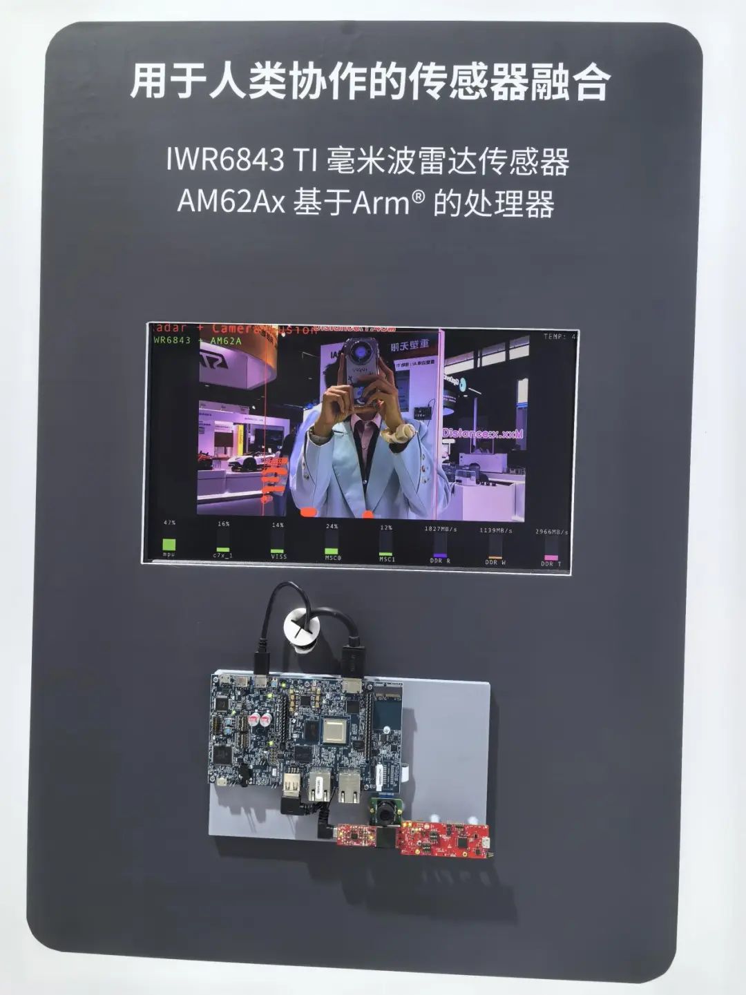 在傳感器領域,毫米波雷達傳感器與攝像頭的結合能夠為機器人導航、視覺識別等方面的能力,也提高了導航精度、物體操作能力和動態環境適應性。TI展示了雷達和攝像頭傳感器融合的解決方案,基於IWR6843 TI毫米波雷達傳感器和基於Arm 的處理器AM62Ax模塊,能夠在60~64GHz頻段中運行。