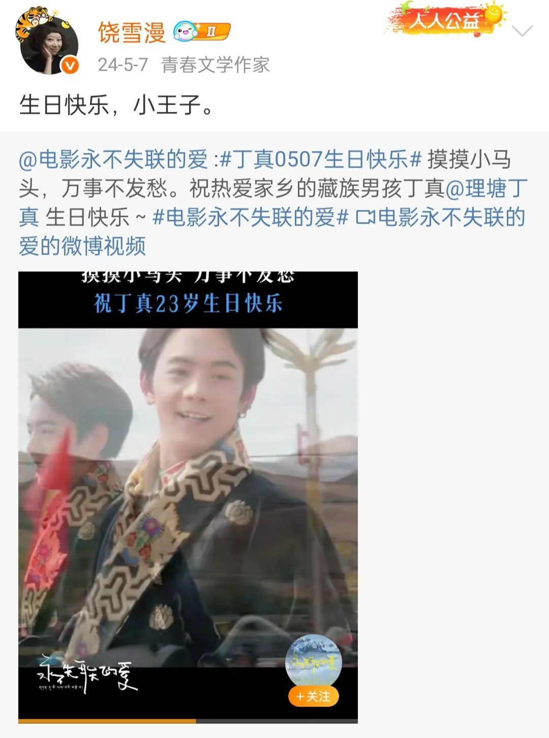 翻看饒雪漫的社交賬號,可以看到早在2024年5月7日就有與丁真有關的互動,標題為:丁真生日快樂,封面是《永不失聯的愛》電影海報。這部電影拍攝於2023年9月至11月,此時電影已經拍攝結束。