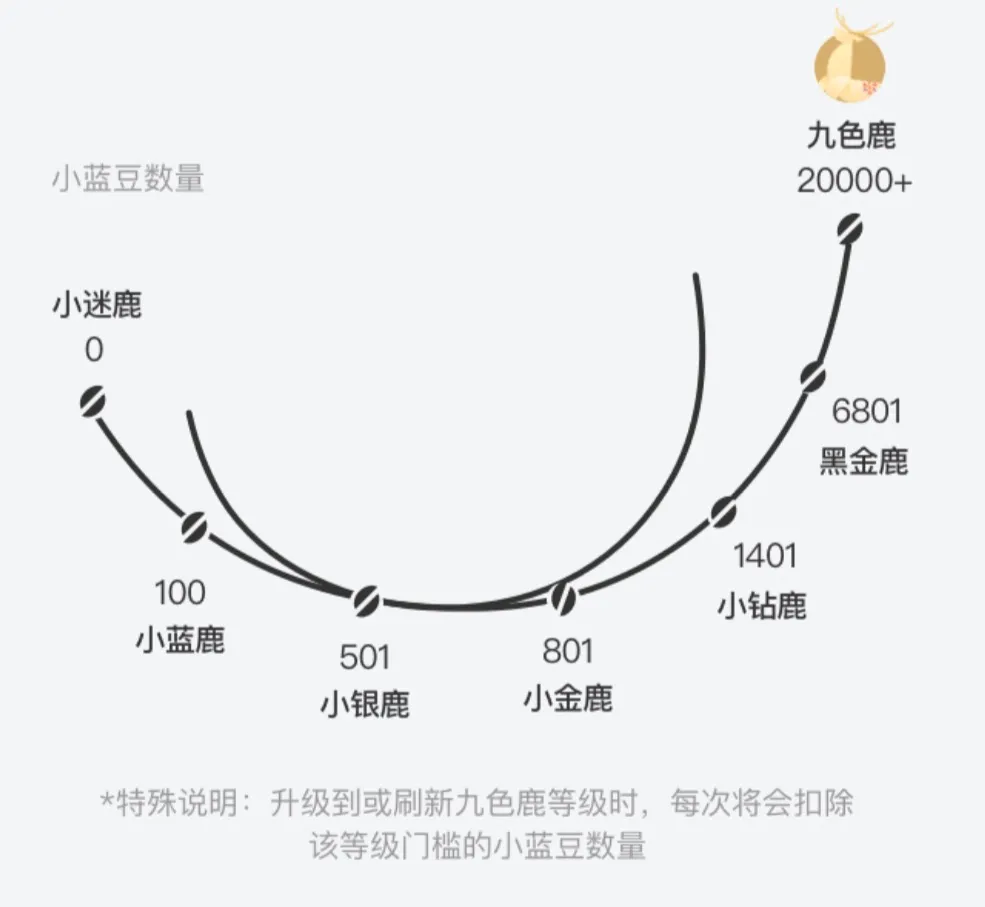 當小藍豆大於等於2萬,即可成為最高等級會員九色鹿,相當於至少需要在APP消費1000元(在不使用積分加倍等情況下)。