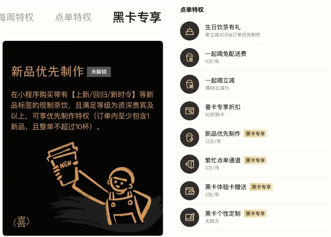 比如,古茗的頂流茗星可享受免單券“買一送一”,以及“9.9元喝飲品”大禮包。喜茶的黑卡貴賓可以享受免費加倍果肉、每年4次“滿88立減15”、9.2折等十幾項特權。