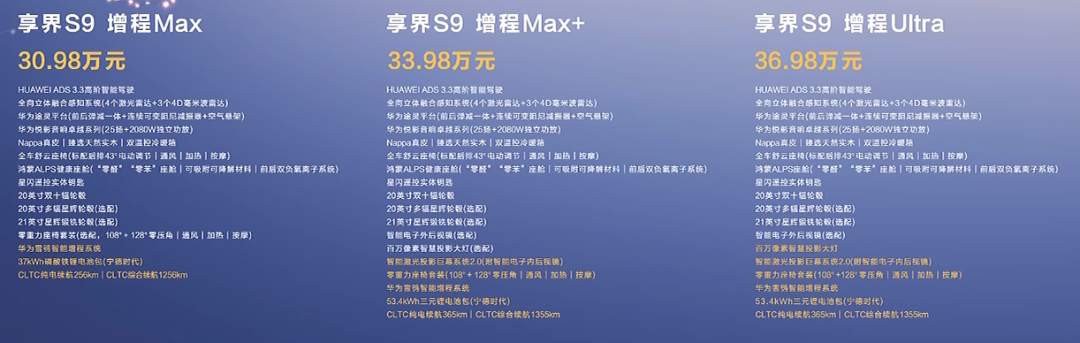 S9純電版售價是39.98-44.98萬,今天的增程版是30.98-36.98萬,入門版足足便宜了9萬元。