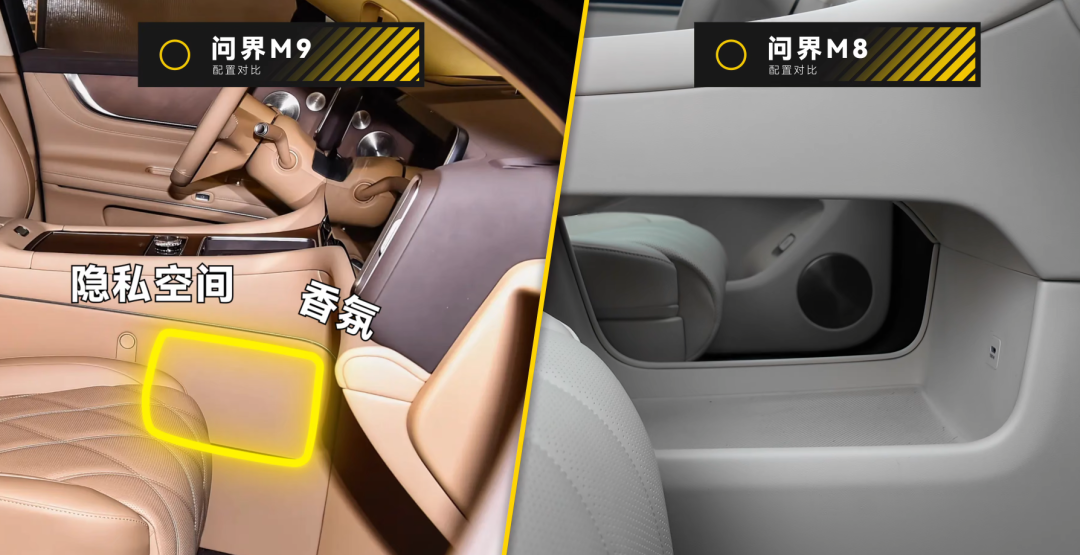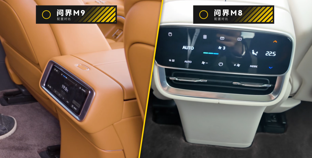 然後新款M9,把冰箱換成了能電動開啓/關閉的實體按鈕,後排屏升級成了可拆卸的單獨屏幕,而M8這個位置是和老款M9一樣,後排屏不可拆卸,冰箱只能電動開啓。