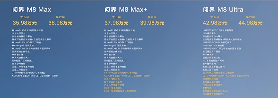 問界M8的售價也還可以,預售價36.8萬元,正式售價是35.98-44.98萬元。全系增程,一共有Max、Max+、Ultra三個配置,每個配置又分為五座和六座版。