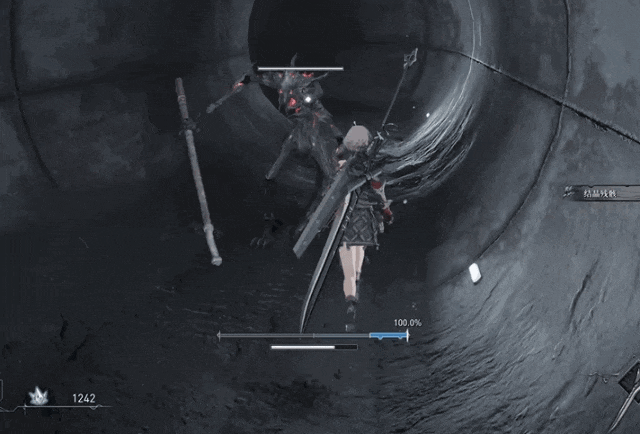但和《卧龍》不同的是,《無限機兵》裏的所有招式和動作都沒有任何其他消耗和CD,而是把同步率作為耗材。想要彈反得有同步率,想要躲在角落發射電磁炮也需要同步率,都必須靠近身肉搏獲得。