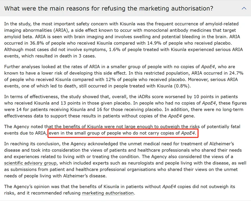 期間多奈單抗吸取了侖卡奈單抗第一次闖關失敗被拒的經驗,直接放棄挑戰ARIA發生率較高的ApoE ε4攜帶人羣。但EMA依然認為,即便對於非ApoE4攜帶者這一小規模人羣,多奈單抗的有限療效收益仍不足以抵消其引發致命性ARIA的風險。