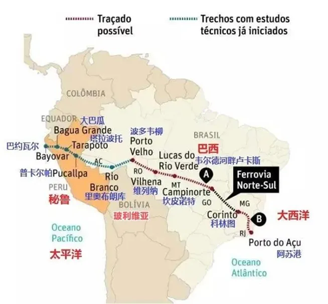 在巴西境內,兩洋鐵路可與巴西規劃在建的東西大鐵路(FICO-FIOL)接軌,向東直至大西洋沿岸的伊列烏斯港。隨着線路貫通,巴西將突破傳統經由大西洋出口至美國和歐洲的格局,藉助秘魯錢凱港及太平洋航線,實現農礦產品等大宗商品面向亞洲市場,特別是中國的更高效出口,進一步拓展國際貿易空間。