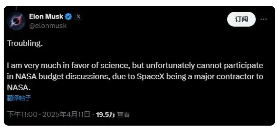 如果説關税戰上的意見相左屬於馬斯克這個精英資本家無論從觀念還是利益上都和MAGA尿不到一上壼裏,那最近馬斯克對NASA預算案中大量關於氣象和深空探測有關的項目被砍表達遺憾這事,實際上鍋還是他自己弄出來的。