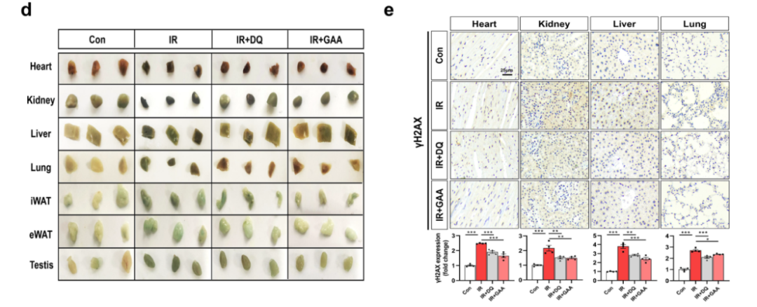 圖注:靈芝酸A能改善小鼠多種組織器官中的細胞衰老(Con:對照組;IR:輻射組;IR+DQ:DQ對輻射小鼠的干預;IR+GAA:GAA對輻射小鼠的干預)