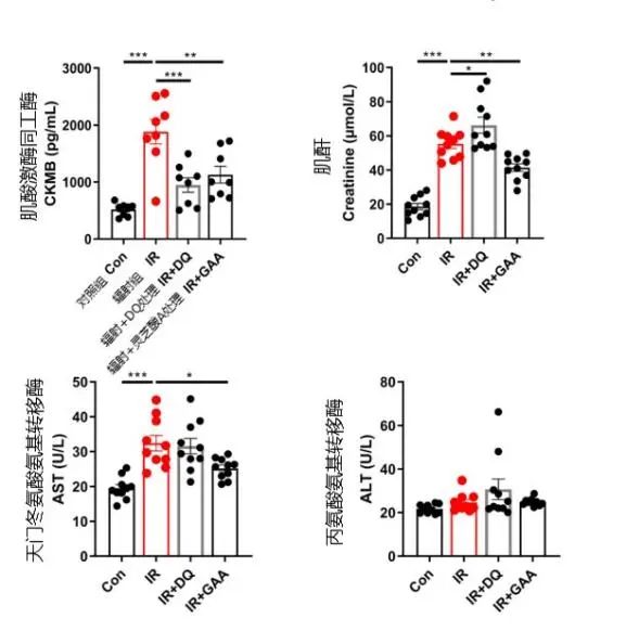 圖注:DQ治療使一些輻射小鼠出現腎臟功能障礙(肌酐升高)及肝臟損傷(ALT和AST升高),靈芝酸A沒有這種情況