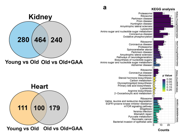 在腎臟和心臟中,研究者發現,分別有464和100種蛋白質在年輕組和靈芝酸A處理的老年組中同時出現。進一步分析發現,核糖體途徑在靈芝酸A處理後變化格外明顯。