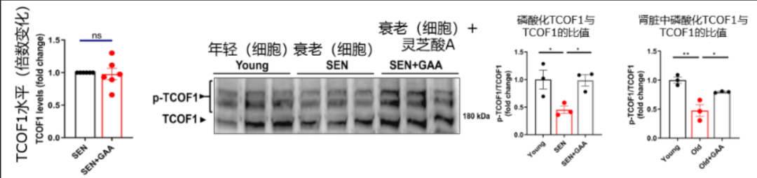 在衰老的HUVECs(人臍靜脈內皮細胞)中,靈芝酸A並沒有像預想一樣改變TCOF1的水平,但卻巧妙地恢復了因衰老而降低的TCOF1的磷酸化水平(PS:磷酸化是蛋白質功能調節的一種重要方式,TCOF1的磷酸化狀態會影響其功能和穩定性)。