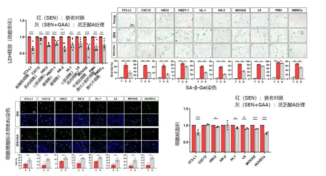 研究者們為靈芝酸A精心找來了十種細胞衰老模型,這些模型來自小鼠、大鼠或人類,具備衰老細胞的典型特點,例如細胞衰老標誌物β-半乳糖苷酶(SA-β-Gal)水平增加、細胞損傷或死亡指標乳酸脱氫酶(LDH)釋放增加,以及細胞核面積增大等。