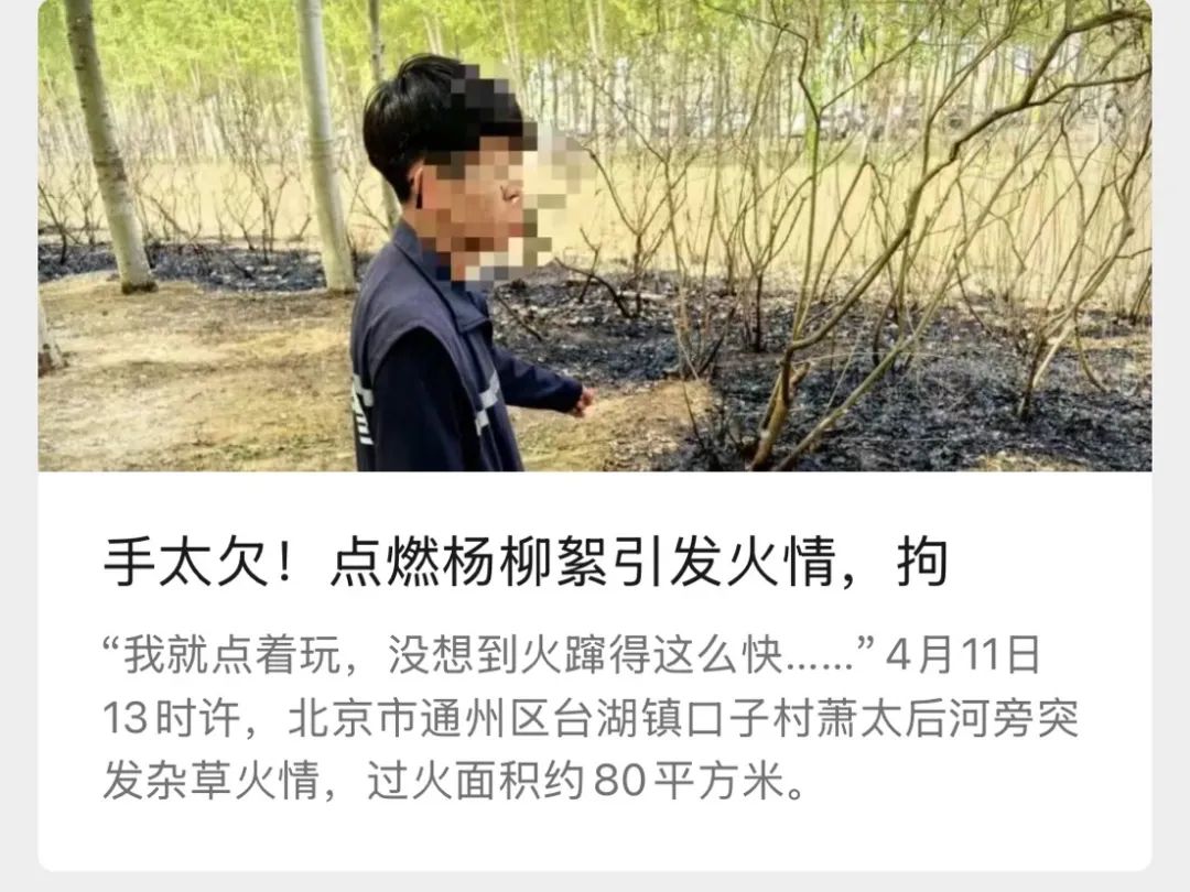 當然“熊”的不止孩子,前不久,兩名年輕人在休息時點燃楊柳絮,引燃了雜草,讓公園的過火面積達到了80平方米,多虧消防員趕到,才制止了更大的火災。