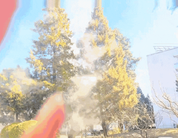 風一吹,整棵柏樹都蒸騰着微黃的煙氣。風再大一點,簡直就跟沙塵暴一樣.