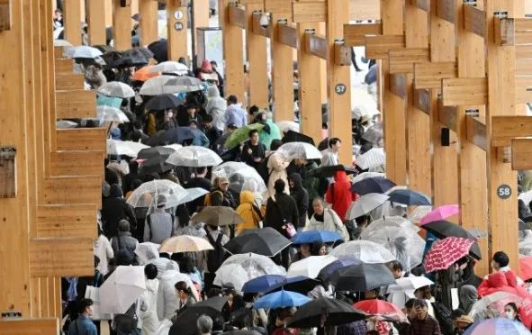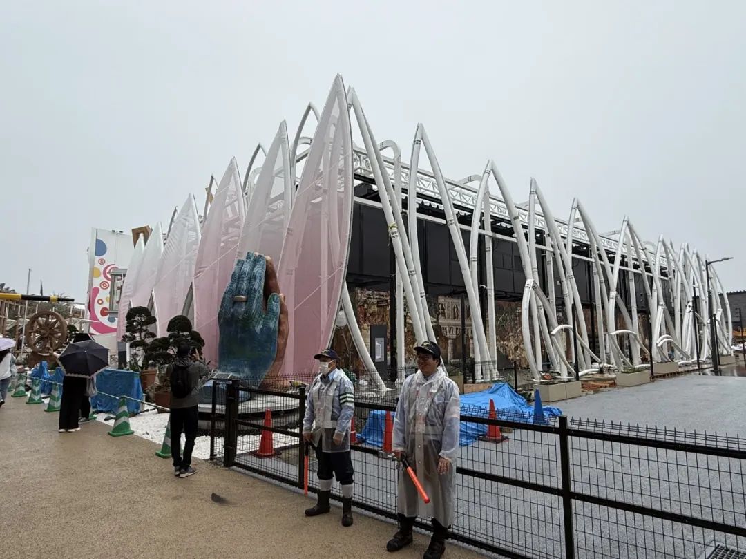 更離譜的是,日本方面居然沒有雨天預案。廣場內缺乏遮風避雨的設施,遊客們只能撐起雨傘,狼狽不堪在滂沱大雨排隊,沒有穿雨鞋的人,鞋子就泡湯了。