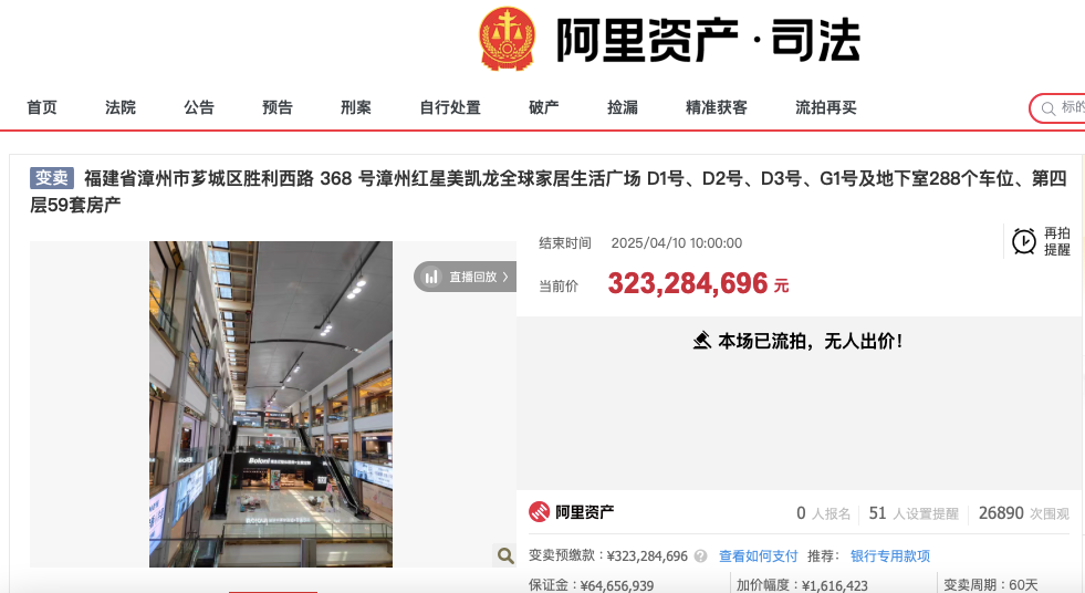 今年最大的一筆拍賣,要屬漳州紅星美凱龍全球家居生活廣場部分資產,評估價5.77億元,僅3.23億元起拍,相當於接近半價出售了,還是多次流拍。